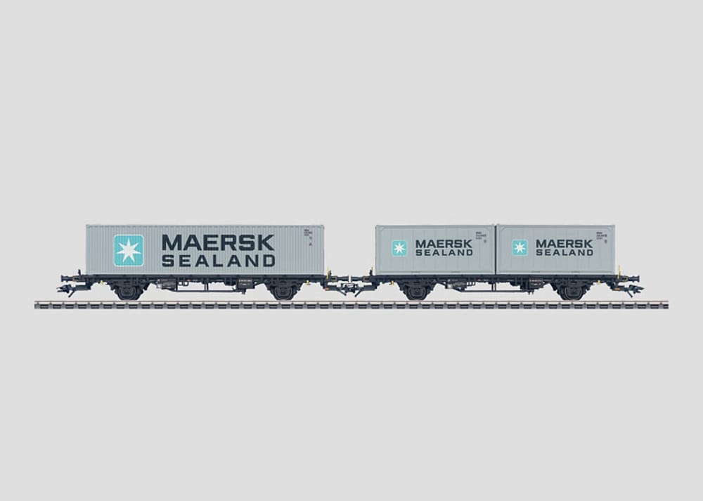 The load surface has a partially open frame. The cars come loaded with 3 removable containers. The cars have different car numbers and the containers have different registration numbers. Length over the buffers 34.1 cm / 13-7/16".