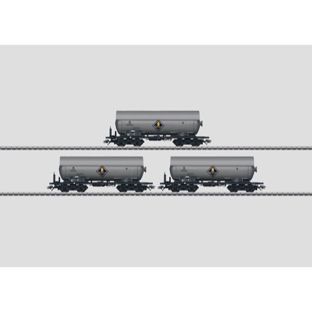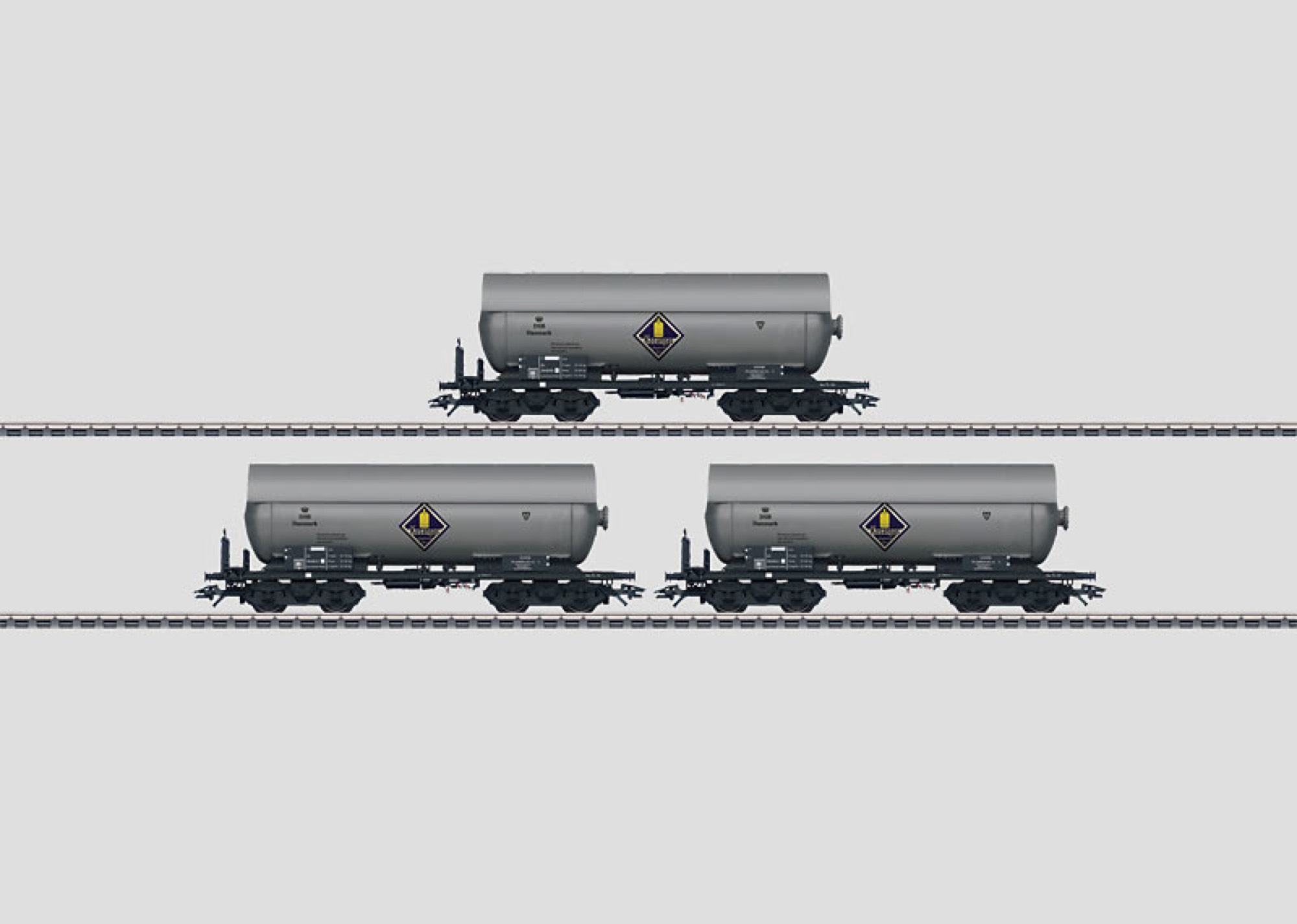 All of the cars have detailed, partially open frames. The side sills are open U shapes facing outwards. The trucks are Minden-Dorstfeld designs. The tanks have heat shields. The cars have separately applied brakeman's platforms. All of the cars have different car numbers and come individually packaged. There is also a master carton. Total length over the buffers 44.2 cm / 17-3/8". DC wheel set per car 4 x 700580.