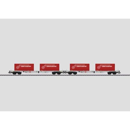 The cars have type Y 25 welded trucks. They also have prototypical partially open flat car floors constructed of metal with striking fish-belly side sills. Each flat car is loaded with 2 convertible truck transport units. Stands for the convertible truck transport units are included separately. The cars have different car numbers and the loads have different registration numbers. They come individually packaged and there is also a master carton. Total length over the buffers 46.0 cm / 18-1/8".