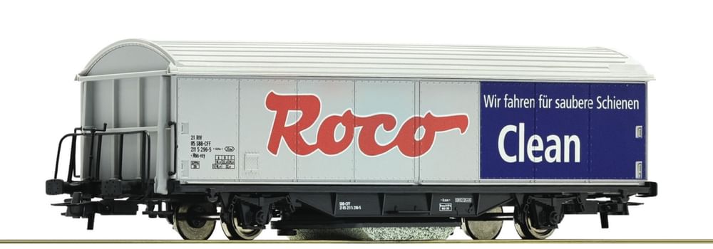 Roco skinnerensevogn, passer til alle 2-skinnesystemer. Vognen har monteret et rense-viskelæder under vognen, som fjerner det værste snavs.