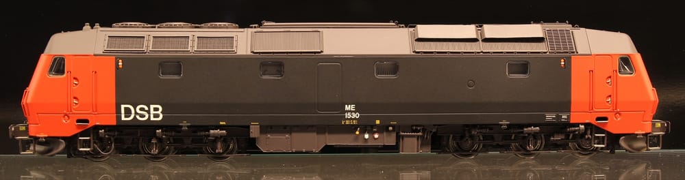 McK 01114: DSB ME 1535, AC m. lyd, Rød/Sort "Lang førerhus". Med skærme og ny lyddæmper. Periode: 1985-2002 Generelt om modellen: Undervogn og vognkasse af metal, fjedrende puffere, ætsede trinplader i rustfrit stål, ætsede riste, viskere, frontbøjler m.m. Rigt detaljeret model, med bl.a. forskellige indretninger i de to førerrum i overensstemmelse med forbilledet. Alle modeller leveres med åben og lukket plov, samt leddelt skruekobling der kan monteres efter ønske. Modellen er udstyret med elektronik udviklet i samarbejde med ESU og indeholder alle kombinationer af front- og slutlys, individuelt lys i førerrum og maskinrum, fungerende færdigmeldingsblink og powerpacks. Alle modeller er udstyret med 2 stk. 4 ohms højttalere. Alle lokomotiver leveres med ESU dekoder, og kan endvidere leveres med lyd incl. kurvelyd. Gennemtestet, kraftfuld og støjsvag 5 polet motor.