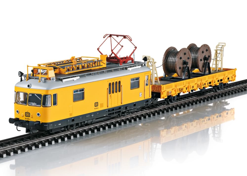 The unit has an mfx+ digital decoder and extensive operation and sound functions. It also has controlled, high-efficiency propulsion. The unit has a compact-design, maintenance-free motor. 2 axles powered. Traction tires. The triple headlights and dual red marker lights change over with the direction of travel, will work in conventional operation, and can be controlled digitally. The headlights can be turned off separately front and rear. The unit has the double "A" light function. Maintenance-free warm white and red LEDs are used for the lighting. The engineer's cab has interior details. The work platform can be raised, lowered, and turned in digital operation. It is controlled using the control knob on the locomotive controller. Function button F1 is used to select running of the unit or activation of the work platform when the unit is stopped. The double arm pantograph can be raised and lowered in digital operation. The pantograph does not pick up power from the catenary. The unit has a special drawbar for coupling the catenary construction car to the powered catenary maintenance rail car. The catenary construction car is loaded with rolls of cable and frames for guiding the cable.