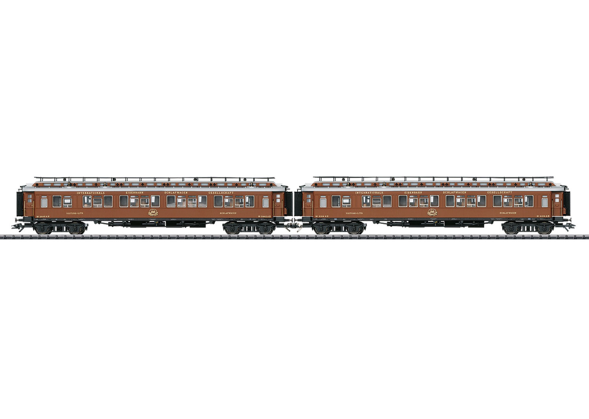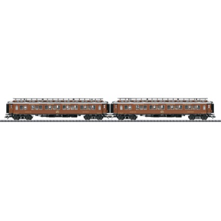 Modell: Feine Ausführung der Modelle mit vielen angesetzten Details. Unterschiedliche Betriebsnummern. Lange Faltenbälge. Beide Wagen mit serienmäßig eingebauter LED Innenbeleuchtung. Stromabnahme an jedem Wagen. Gesamtlänge über Puffer ca. 48,5 cm.