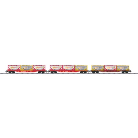 Modell: Epoche V. Drehgestelle Typ Y 25. Vorbildgerecht durchbrochener Tragwagen-Boden aus Metall mit markanten fischbauchartigen Außenlangträgern. Angesetzte Trittstufe. Jeder Tragwagen ist beladen mit jeweils 3 20ft- Tankcontainern. Wagen und Ladung mit verschiedenen Betriebsnummern und jeweils einzeln verpackt. Kupplungsaufnahme nach NEM und Kinematik für Kurzkupplung. Zusätzliche Umverpackung. Gesamtlänge über Puffer 681 mm.