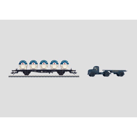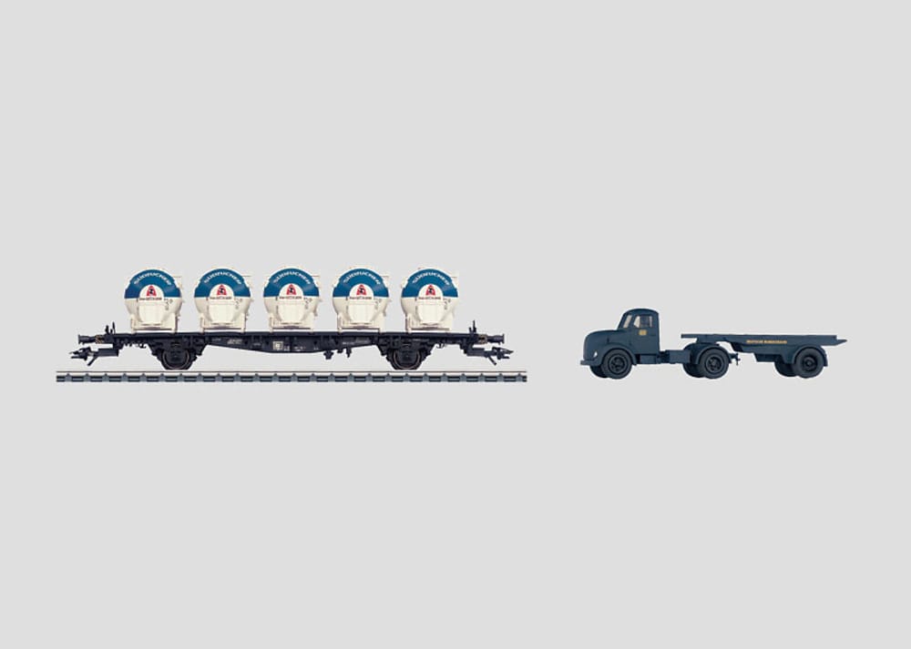 The car comes with high-impact buffer beams and separately applied grab irons. The car is loaded with 5 removable containers painted and lettered for "Südzucker". The containers have separately applied details and different registration numbers. Length over the buffers 17.0 cm / 6-11/16". The truck model has a metal superstructure and trailer.