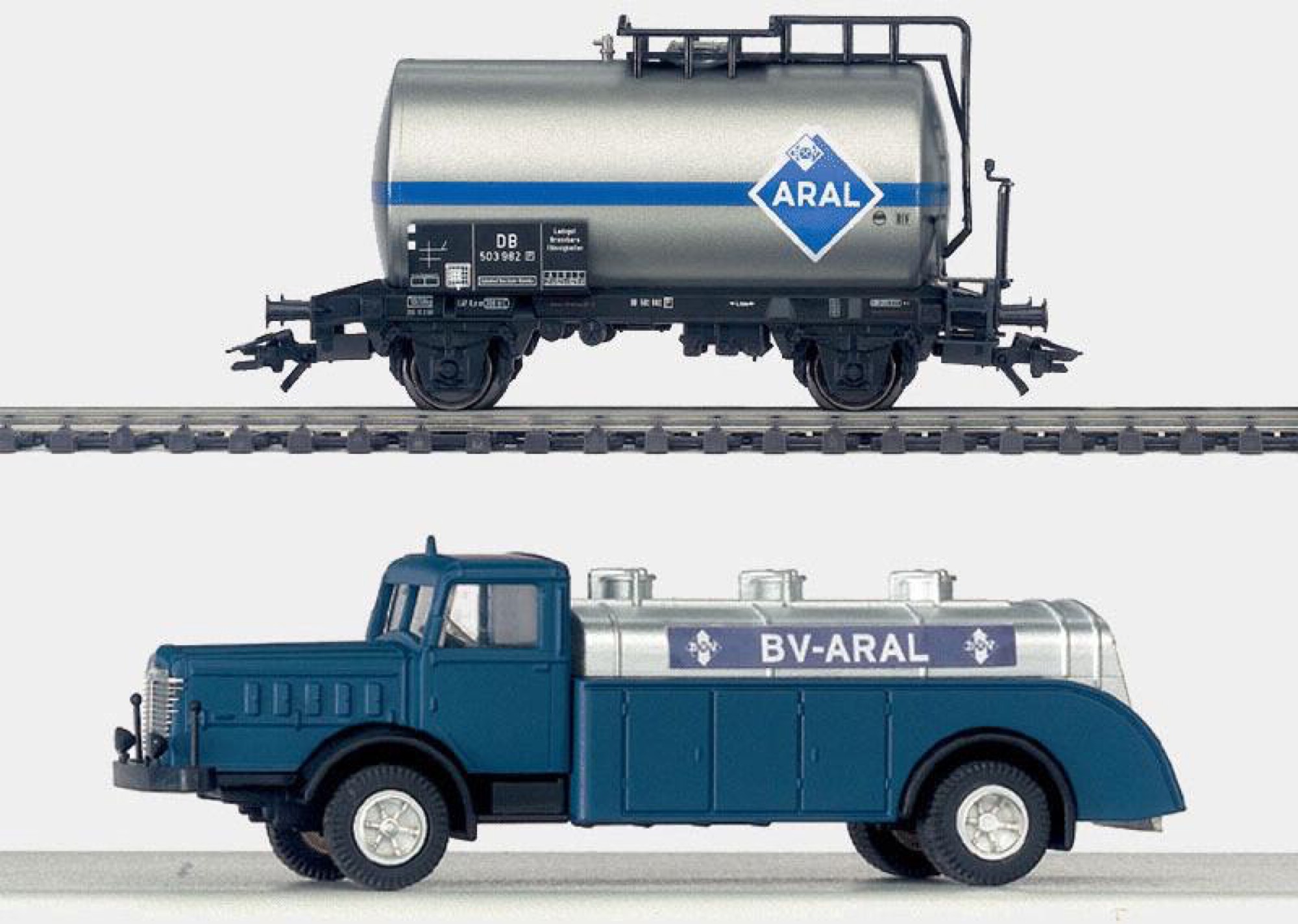 Tank car comes with separately applied ladders. Length over buffers 10.0 cm 3-15/16*. Truck with metal frame and chassis. Rear axle has double tires. Front axle has Trilux rims. Radiator is plated with aluminum. Truck length 9.8 cm / 3-7/8*.