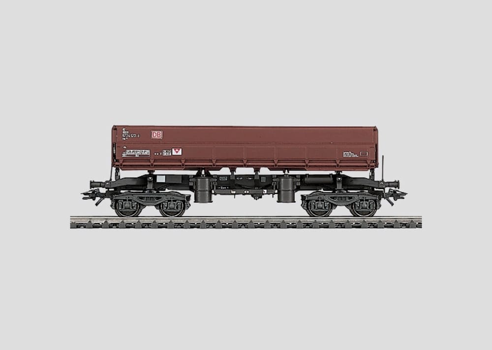 The hopper can be tipped to both sides and is mounted in a guide mechanism. The compressed air cylinders have moving parts and pneumatic rams. The side walls on both sides are 2 hinged pieces that can be opened for unloading. Length over the buffers 14.0 cm / 5-1/2". DC wheel set 4 x 70 0580.