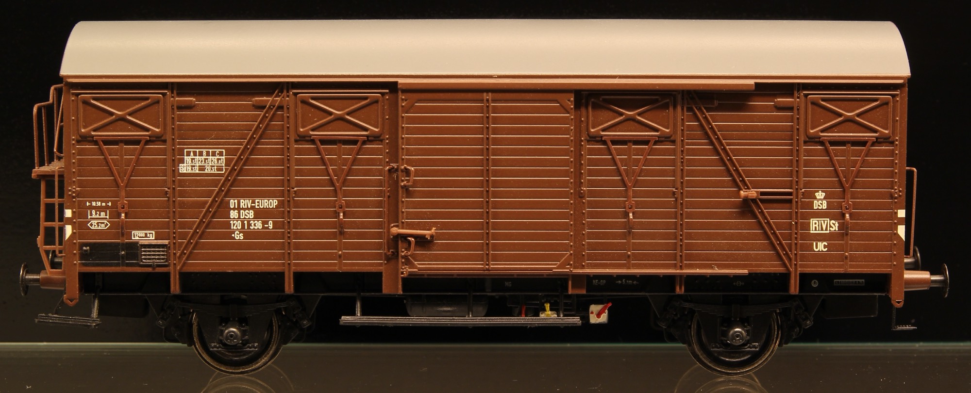 McK 0607: DSB Gs 01 86 120 1 336-9, Serie I, Brun med mørkegråt tag. Periode 1966-1974 Generelt om modellen: Modellerne består af en støbt metalbund og en vognkasse af plast, og er efterfølgende opbygget af mange løst fremstillede dele i både metal og plast. Vognene har blandt andet fjedrende puffere af messing, ætsede hjørnetrin, håndbøjler af metaltråd og rigt detaljeret bremsesystem. G/Gs 1-vognene leveres indledningsvis i følgende varianter: Litra G, femcifrede numre, brun vognkasse og sølvfarvet tag, med og uden EUROP-mærkning (leveringsudgave) Litra Gs, Femcifrede numre, brun vognkasse og sølvfarvet tag, EUROP-mærkede. UIC-numre, brun vognkasse og gråt tag. DSB-design, sidste udgave, brun vognkasse og brunt tag, ”RAL 8025-design”