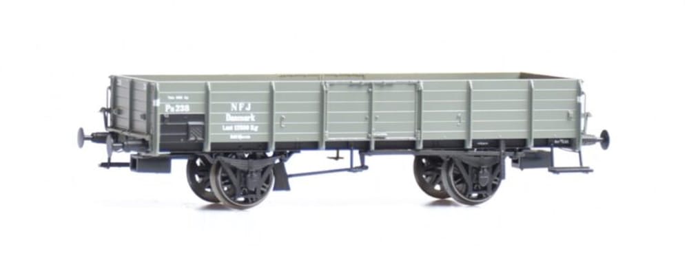 Model af NFJ åben godsvogne litra PF. Vognene er malet i Nordfynske Privatbaners olivengrønne godvognsfarve.
