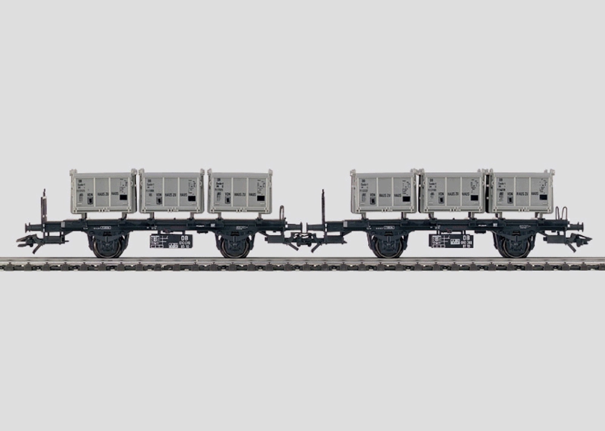 Separately applied destination boards. Different car numbers. Each car loaded with 3 removable coal containers, each container with different registration number. Total length over buffers 22.8 cm (9*).