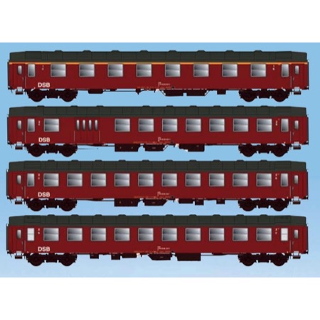 Tysk (original): Set D 274 „Nordpfeil“ Hamburg Altona–Aarhus, bestehend aus einem 1.-Klasse-Wagen, zwei 2.-Klasse-Wagen und einem gemischten 2.-Klasse-/Gepäckwagen der DSB in roter Lackierung, im Einsatz Anfang der 1990er Jahre.