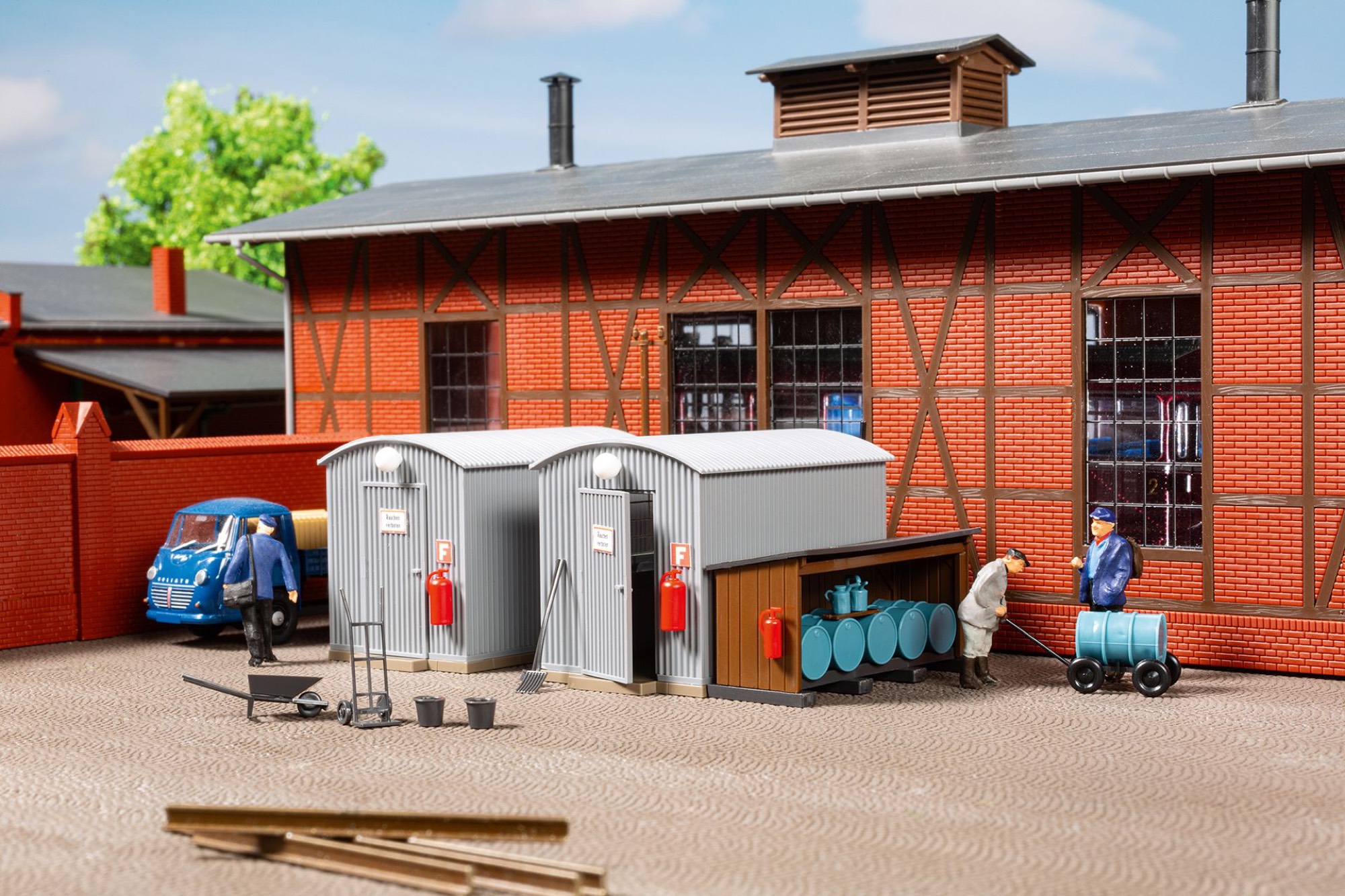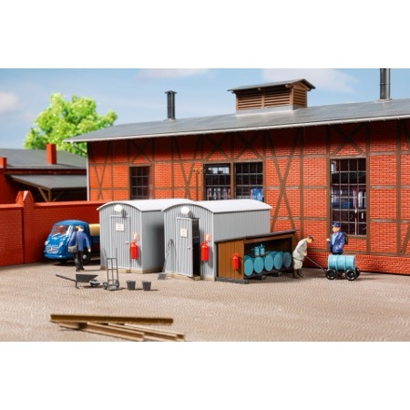 2 Wellblechhütten als Öllager mit viel Zubehör. Die Türen können geöffnet dargestellt werden.