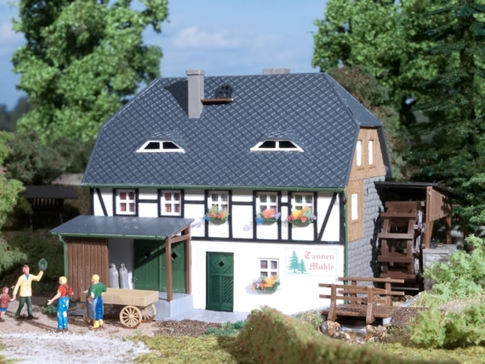 This hip-roofed structure can be used as a mill for corn or oilseed. Turning water wheel, wooden footbridge over the millrace, simple halftimbering, shed and outhouse in the rear and dungheap for the miller’s animals. The wooden waterwheel is stored for the impulse with the water pump, see article No. 60150 made by company NOCH, swivelling. This charming model can be combined with the Forester’s house No. 12 225 and the Wooden house Erika No. 12 259 to make a stunning woodland idyll.