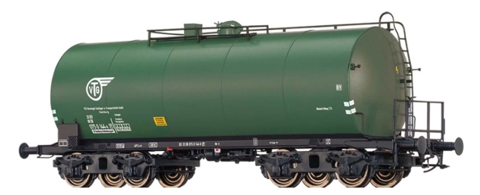 $Drehgestell mit Dreipunktlagerung$Extra angesetzte Federpakete$Extra angesetzte Bremsanlage$Räder aus Metall$Fein gravierte Drehgestelle$Bremsbacken in Radebene$Extra angesetztes Achsbremsgestänge