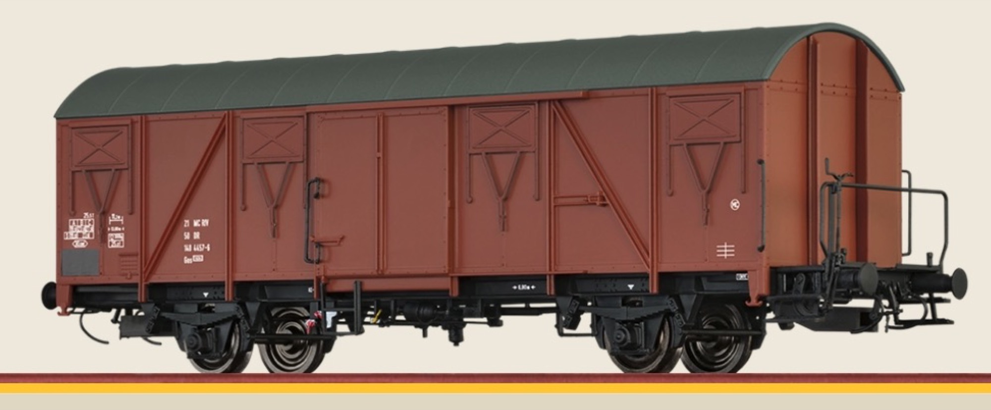 $Bremsbacken in Radebene$Drehgestell mit Dreipunktlagerung$Extra angesetztes Achsbremsgestänge$Extra angesetzte Bremsanlage$Maßstäblich schmaler Rahmen$Metallachshalter$Radsätze auch innen profiliert