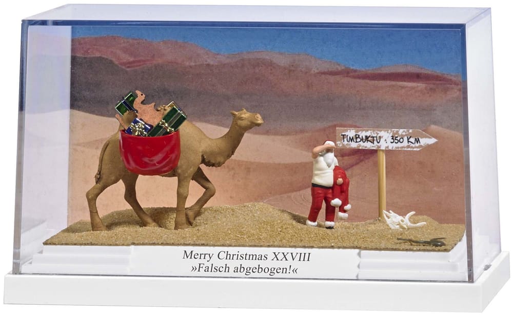 Diorama: Merry Christmas XXVIII "Wrong turn!" Oh dear, no Christmas tree in sight, just desert and a fully loaded camel! Santa Claus took a wrong turn somewhere and is now completely lost. Will he be able to deliver the Christmas presents on time under these circumstances?