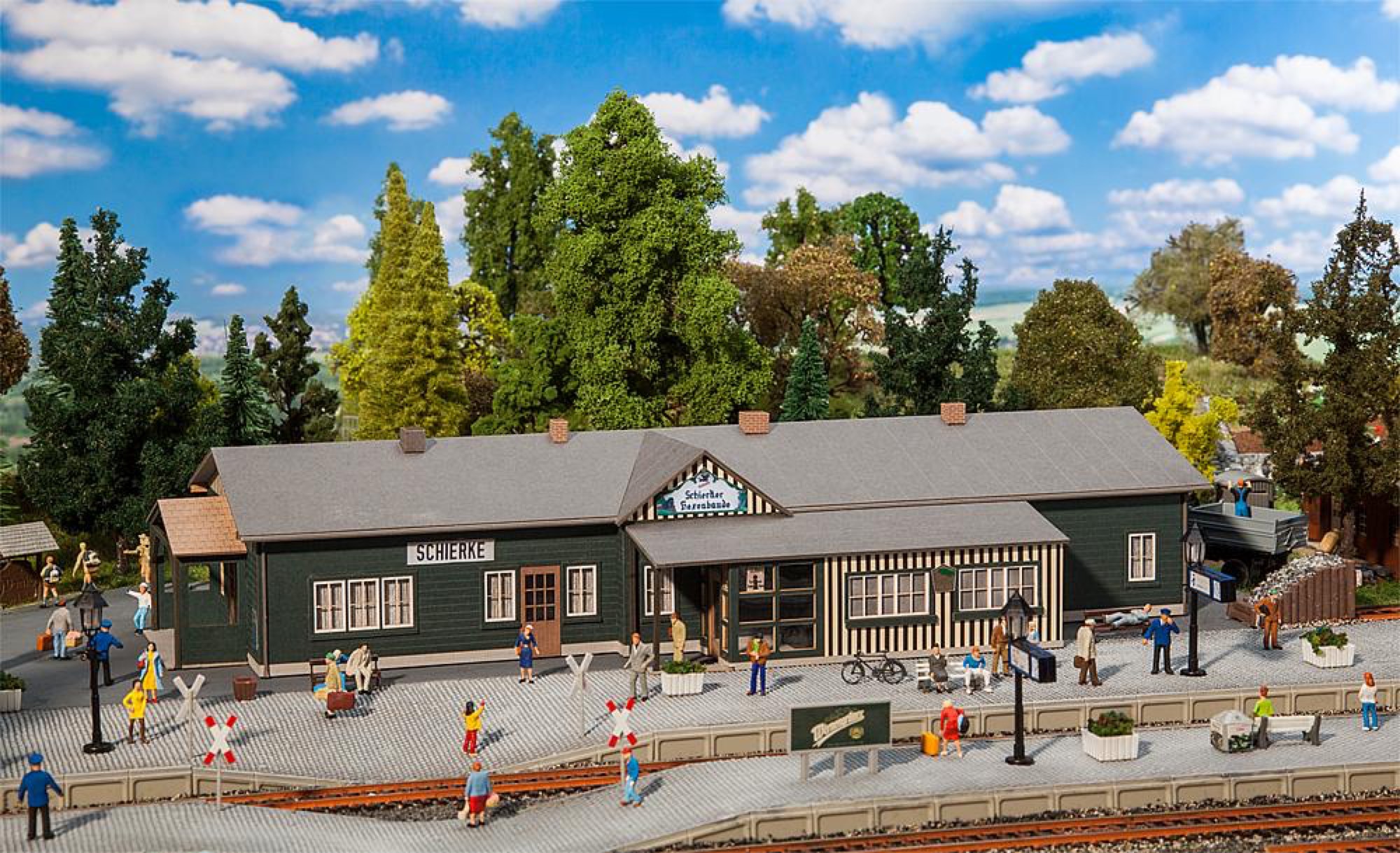 Flat out up Mount Brocken! Laser-cut model according to the original »Schierke« through station operated by the Harz Narrow-gauge Railways (HSB), built in the historical Harz style, with stone foundation and partly coloured wood siding that protects the facade from wind and storm. Tickets and souvenirs are sold in the adjoining extension.