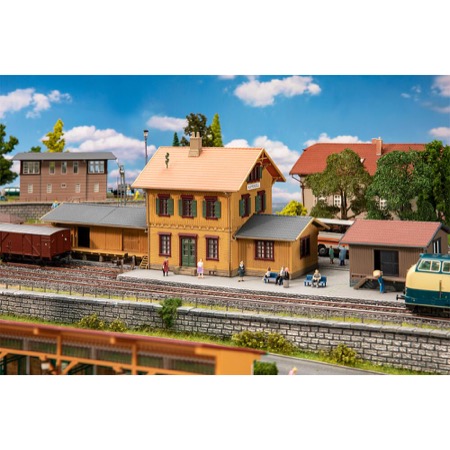 Kleiner ländlicher Güterbahnhof, bestehend aus einem zweigeschossigen Mittelbau und seitlich angebauter Wartehalle und einem Lagerschuppen mit Laderampe. Das Modell wurde in Anlehnung an das historische Originalgebäude im Hohenloher Freilichtmuseum in Wackershofen gebaut.