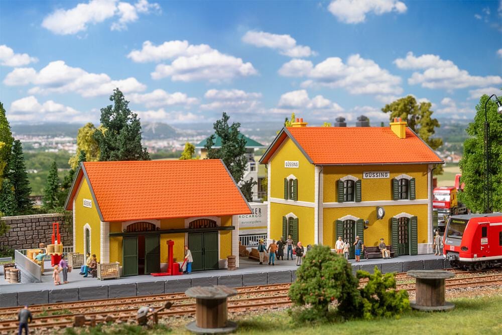 Während der nächste Modellzug gemächlich auf das Gleis einfährt, herrscht reges Miniatur-Treiben am Bahnhof Güssing! Der kleine zitronengelbe Bahnhof mit seinen dunkelgrünen Fensterläden und dem charmanten roten Ziegeldach fügt sich nahtlos in die unterschiedlichsten Landschaften ein. Farblich inspiriert vom realen Bahnhof Güssing in Österreich, setzt auch das Modell mit seinem leuchtenden Anstrich fröhliche Akzente auf der Modellanlage!