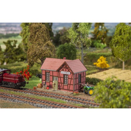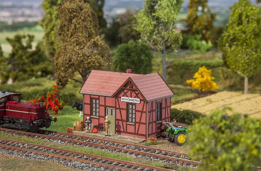 Unique edition! Laser-cut model of a small station building at a halt similar to some originals located on secondary lines in the Schwäbisch Hall district. Timber framework with exposed wall made of bricks in a beautiful red shade and a hipped roof at a corner. Can be used in rural or urban areas.