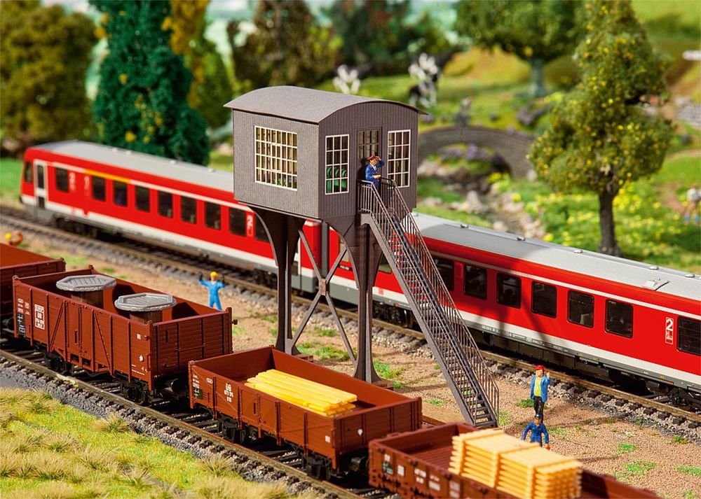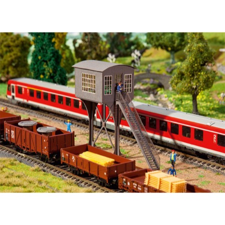 Miniature of a Prussian switch tower on stilts with corrugated sheet covering and inner furnishings from the collection of the Bochum Railway Museum. The stilt construction reduces the amount of space required to a minimum.