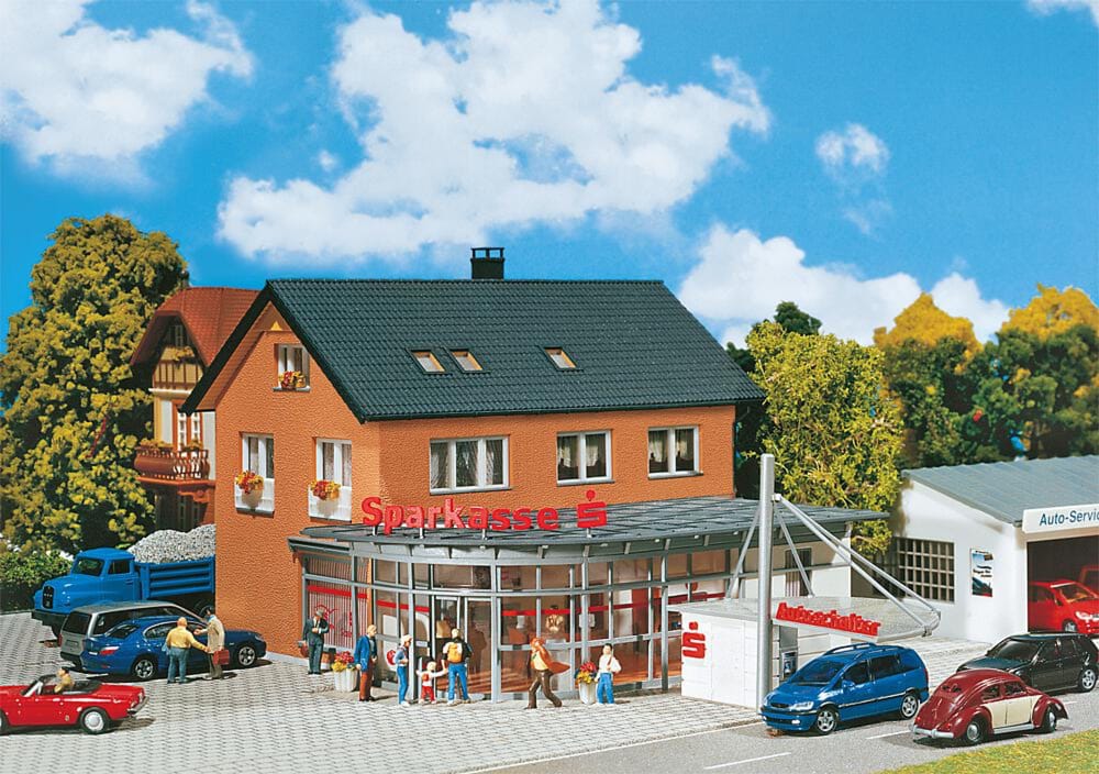 Sparkassengebäude mit angebautem Service- und Schaltertrakt, ausgestattet mit typischen Einrichtungsobjekten wie Geldautomaten, Info-Theke, etc. Der freistehende, überdachte Autoschalter kann mit Car System-Fahrzeugen angefahren werden.