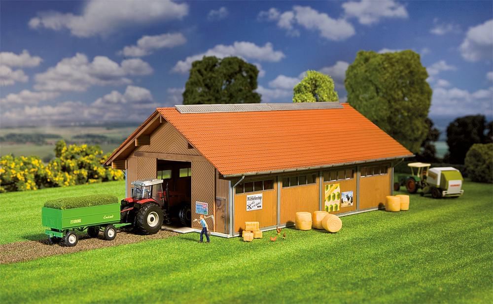 Spacious present-day stable building for cattle or horse keeping, which can be furnished by purchasing the stable interior equipment (art. 130525). The broad sliding gates on both sides of the building can be made to open and close by mounting the door drive unit (art. 180624, not included). The stable lends itself to the through traffic of Car System vehicles (art. 161536 + art. 161552). Can be used as autonomous building or to supplement art. 130520.