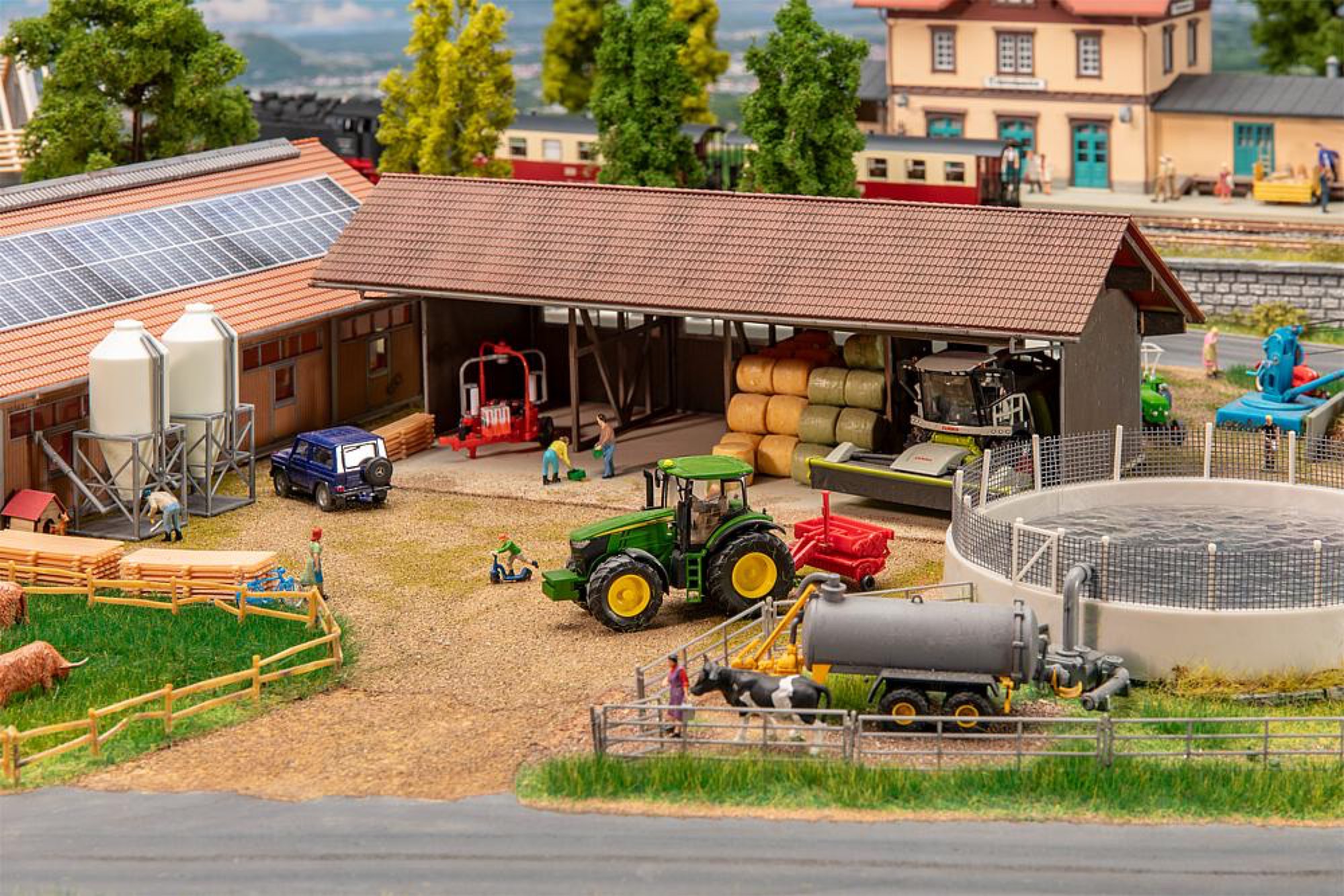 Für die Gestaltung eines landwirtschaftlichen Betriebs gut geeignetes Ensemble aus zwei Futtermittelsilos, überdachtem offenem Geräteunterstand und einer offenen Güllegrube mit Zubehör wie Pumpe und Rohre.