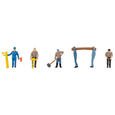 Harte Arbeit an den Schienen!_x000D_ Das Set zeigt sechs fleißige Gleisbauarbeiter bei verschiedenen Tätigkeiten: vom Stemmen mit dem Presslufthammer, dem Tragen schwerer Holzträger bis hin zum Hantieren mit Werkzeugen. Ideal zur realistischen Gestaltung von Baustellenbereichen entlang der Schienen – für mehr Bewegung und Authentizität auf deiner Modellbahnanlage.