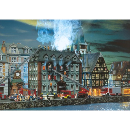 Ein Klassiker, den viele kennen: das »Brennende Finanzamt«. Das Besondere an diesem Bausatz ist die verwitterte, von Rauch geschwärzte Fassade, die ihm einen einzigartigen Charakter verleiht. _x000D_ Für eine realistische Nachbildung kann das Modell mit einem Rauchgenerator (Art. 180690) und einem Brandflackern (Art. 180695) ausgestattet werden.