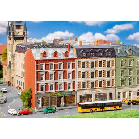 Town atmosphere! Two four-storey apartment buildings with clinker facades, architectural stucco decoration from the period of promoterism, and shops on the ground floor. Both models can be built separately and integrated in a row of houses in a variety of ways.