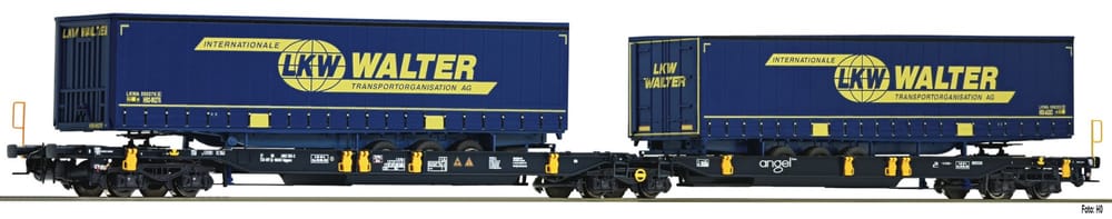 Doppeltaschen-Gelenkwagen Sdggmrs/T2000 der WASCOSA mit LKW WALTER-Aufliegern, Epoche VI.
