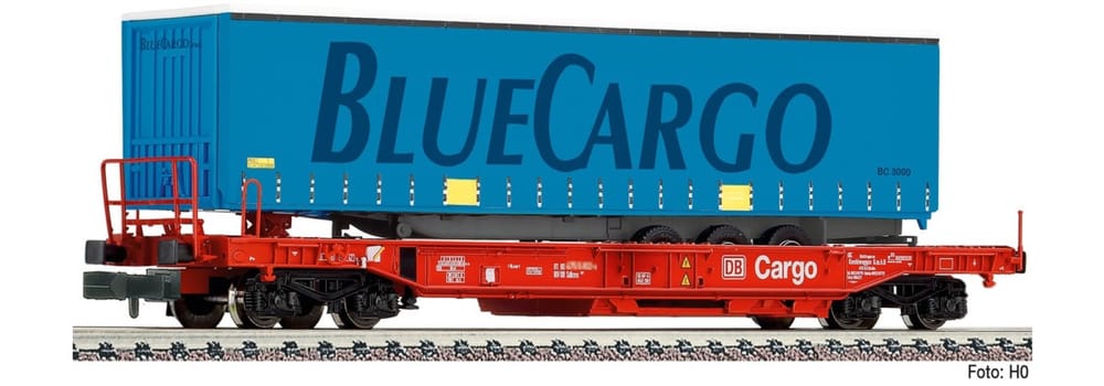 Einheitstaschenwagen mit Auflieger "BlueCargo" der Deutschen Bahn AG (DB Cargo), Epoche VI.