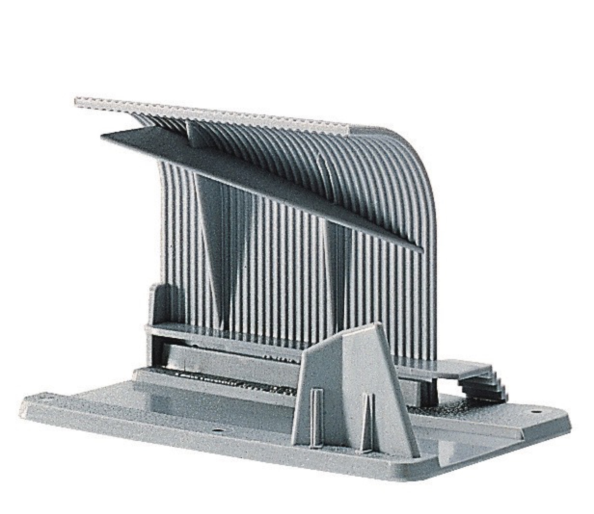 Entladestelle für Lorenkippwagen 8500 bestehend aus überdachter Entladevorrichtung und Rückstellglied, verwendbar für alle geraden N-Gleise. Die Entladestelle kann nur durch schiebende Lokomotiven bedient werden, wobei diese dann nur bis vor das Entladeteil fahren können!