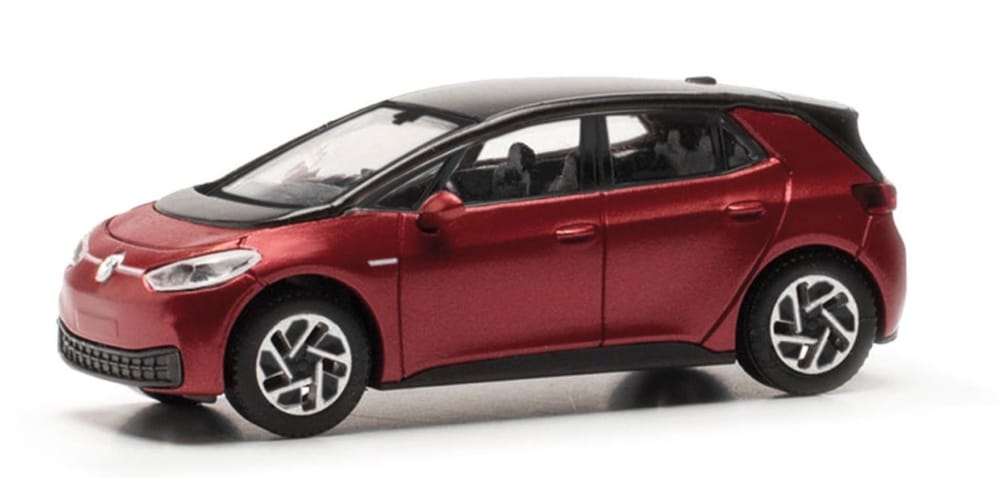 Formneuheit ! Der VW ID3 von Volkswagen steht bei Herpa in den Startlöchern und wird bei den Metallicfarben zunächst in Kings red metallic mit schwarzem Dach zur Auslieferung kommen.