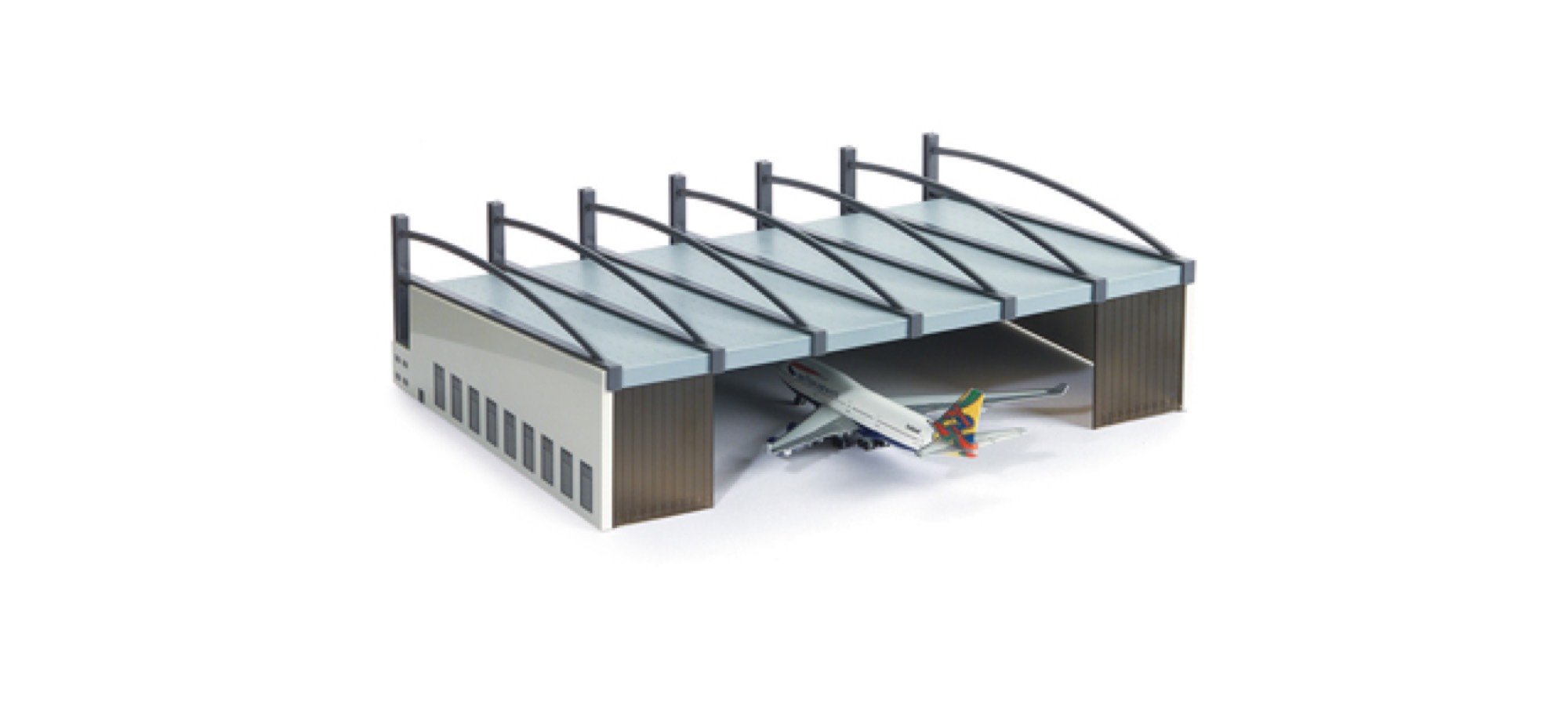 A great addition to your airport buildings in the 1/500 scale: a hangar for your diorama. It is 25 centimeters (9.8 inches) wide, 18 centimeters (7.1 inches) deep, and 7 centimeters (2.8 inches) high.