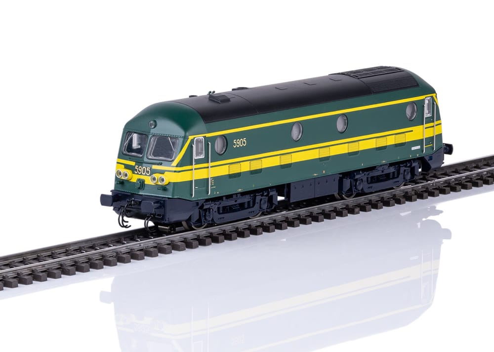 >Prototype: Belgian State Railways (SNCB/NMBS) class 59 diesel locomotive. Version with double lamps below and an additional headlight above and solid disc wheels. Rectangular buffers. Locomotive road number 5905. The locomotive looks as it did in 1989.