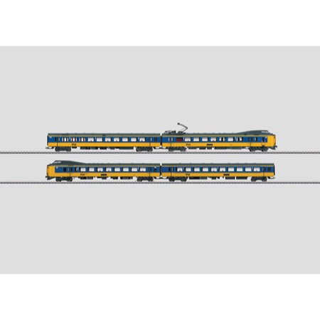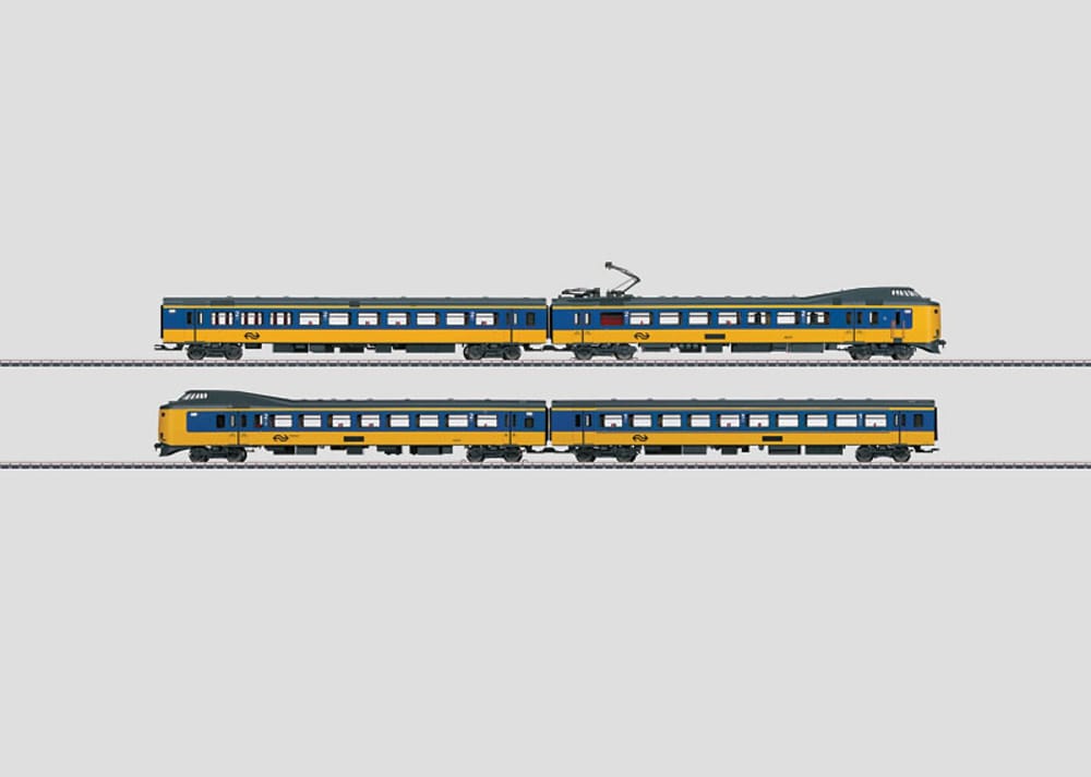The train has an mfx+ digital decoder and extensive sound functions. It comes in a four-part version. The powered end car has a die-cast frame. The train has controlled, high-efficiency propulsion with a flywheel. 2 axles in one truck powered. Traction tires. The engineer's cabs in both end cars have interior details. The train has power pickup in the end car at the front of the train; the power pickup changes with the direction of the train. It also has special close couplers with a guide mechanism. The train has factory-installed interior lighting. The interior details vary with the type of car. The triple headlights, dual red marker lights, and the interior lighting will work in conventional operation and can be controlled digitally. The headlights at car ends 2 and 1 can be turned off separately in digital operation. Light yellow and red LEDs are used for the headlights and marker lights. Warm white LEDs are used for the interior lighting. The construction of the running gear and the bodies is detailed. There is a representation of the "Scharfenberg" coupler with a cover on the end cars. A rigid drawbar coupling is included for multiple unit operation. The end cars come from the factory with closed crossover doors. A plug-in part included with the train makes it possible to represent swinging doors with a diaphragm pushed to the side on one end car. Total train length 114.8 cm / 45-3/16".