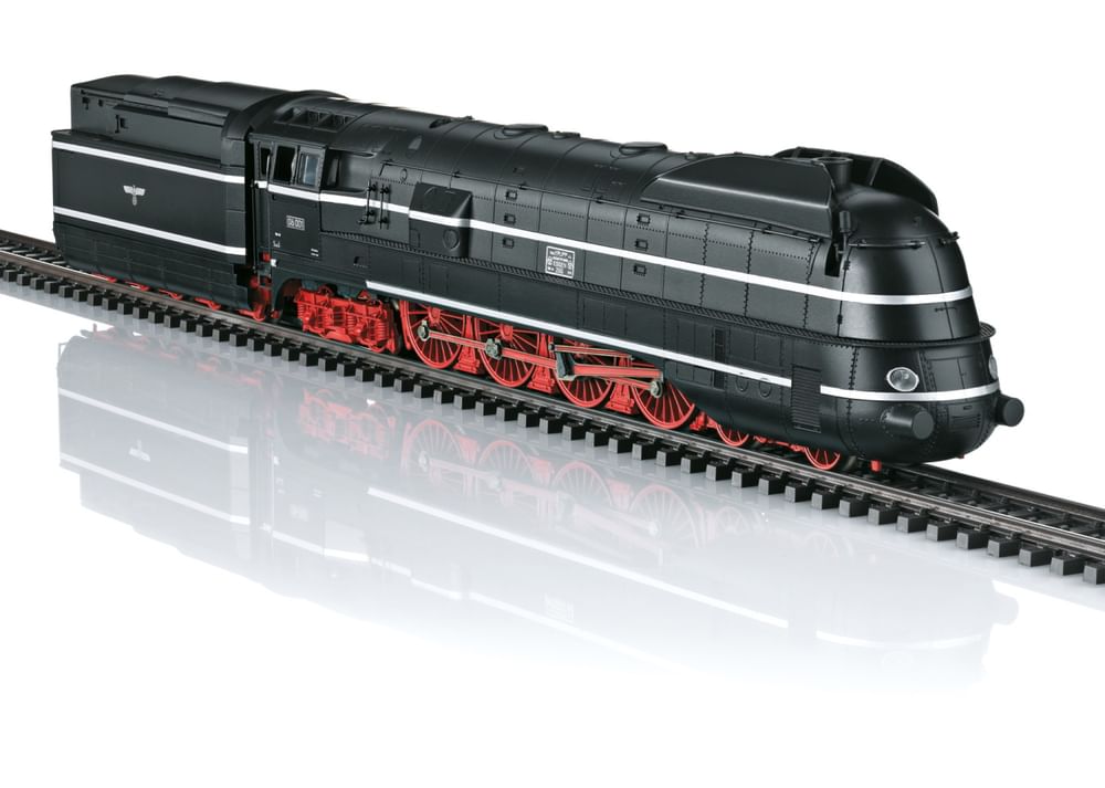 >Prototype: German State Railroad (DR) express steam locomotive, road number 06 001. At its time the most powerful, largest, and heaviest unit on the German State Railroad. Complete streamlining included, inductive magnet on the right side of the locomotive on the trailing truck, and a cover for the coalbunker included. Deep black basic paint scheme with decorative striping. The locomotive looks as it did at the end of the Thirties.