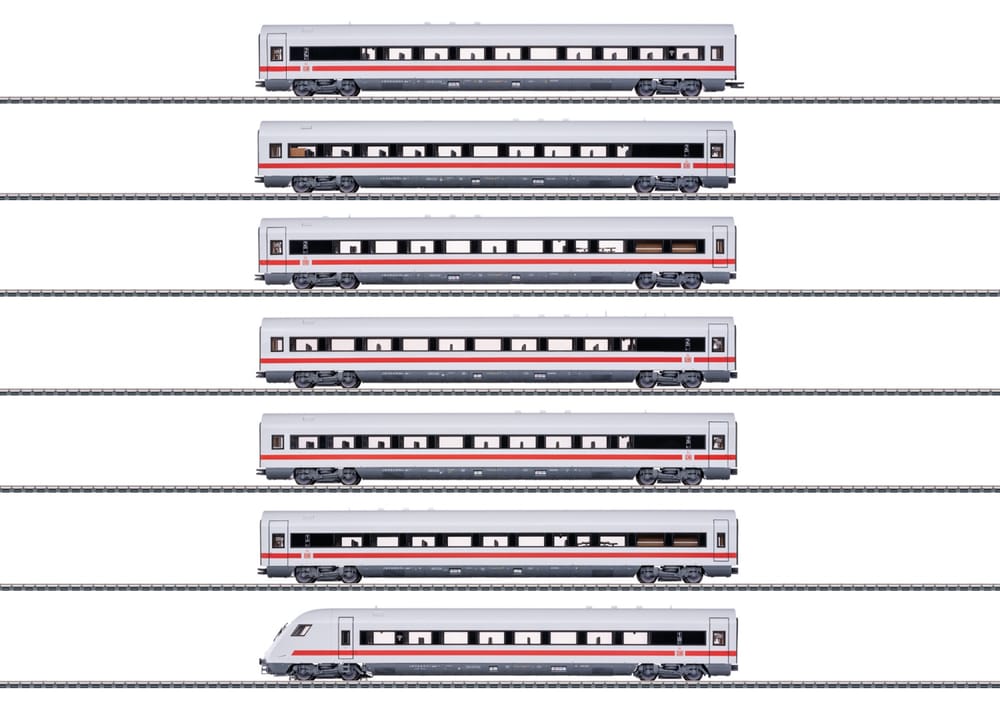 >Prototype: German Railroad (DB AG) ICE express train passenger car set comprising 7 former Metropolitan passenger cars of various types in ICE/IC livery. One type Apmz 116.0 express train passenger car, 2nd class, running number 1. 1x type Apmz 116.1 express train passenger car, 2nd class, running number 2. 1x type Apmkz 116.6 express train passenger car, 2nd class, running number 3. One type Apmz 116.4 express train passenger car, 2nd class, running number 4. One type Apmz 116.2 express train passenger car, 2nd class, running number 5. One type Apmkz 116.6 express train passenger car, 1st class, running number 6. One type Apmbzf 116.8, express train control car, 1st class, running number 7. Train route Cologne - Berlin Ostbahnhof, as ICE 1051. The cars look as they did after 2015.