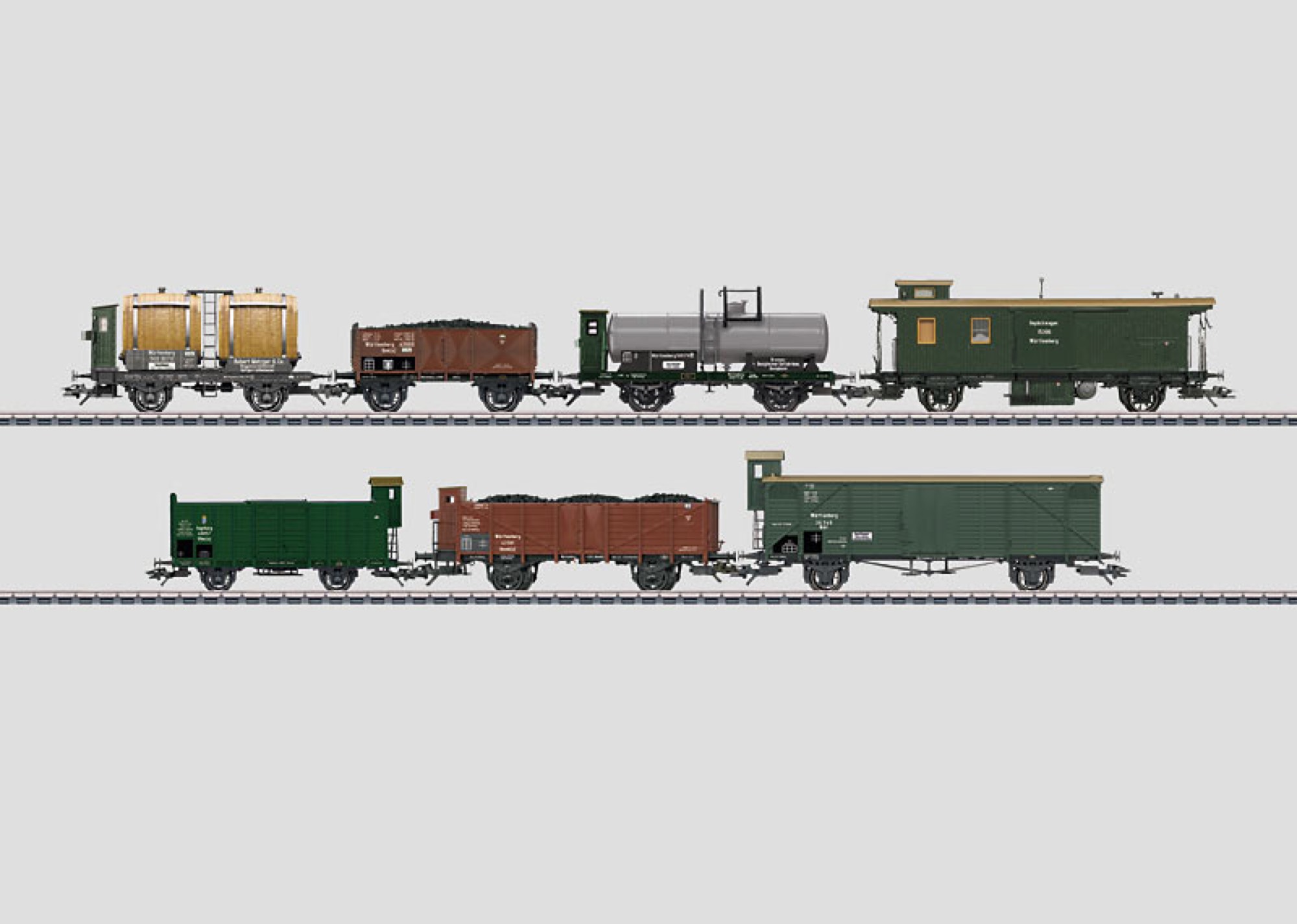 The two type Omk[u] gondolas are loaded with scale-sized coal. All of the cars have different car numbers. Total length over the buffers approximately 74.2 cm / 29-1/4". DC wheel set for cars 1, 4, and 5: 700630. DC wheel set for cars 2 and 7: 36669200. DC wheel set for cars 3 and 6: 700580.