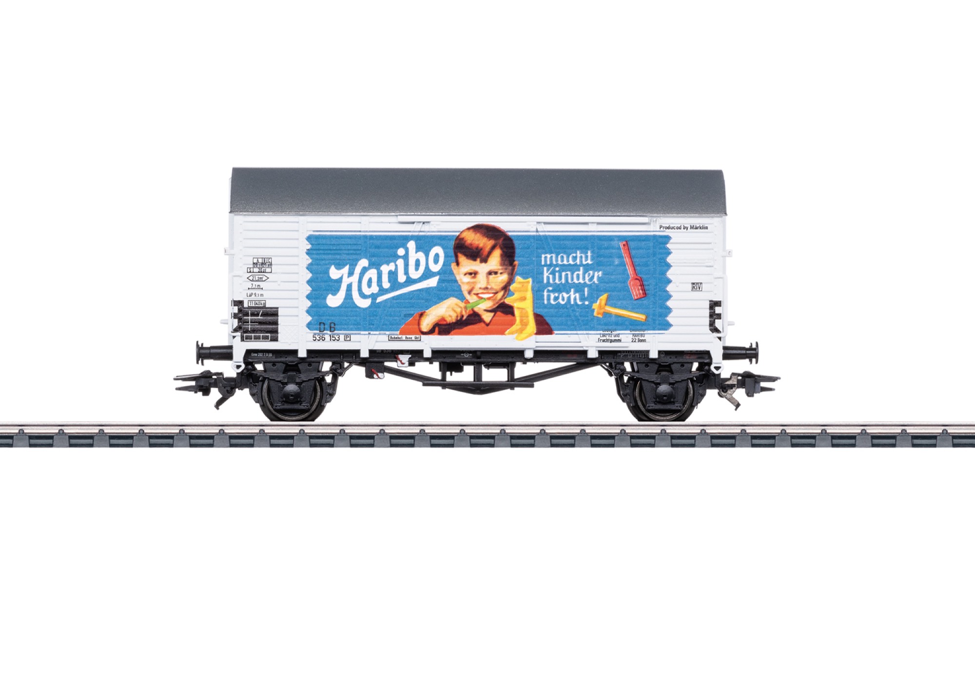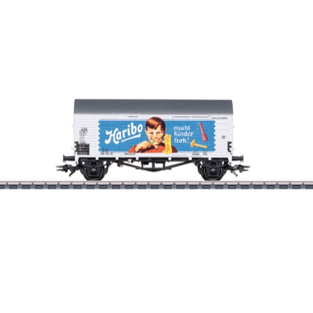 >Prototype: Type Gms 30, former Ghs "Oppeln". Short version without a handbrake, brakeman's platform and without a brakeman's cab. Privately owned car for the firm Haribo, Inc. KG, Bonn, Germany. Used on the German Federal Railroad (DB). Promotional theme included. The car looks as it did around 1962.