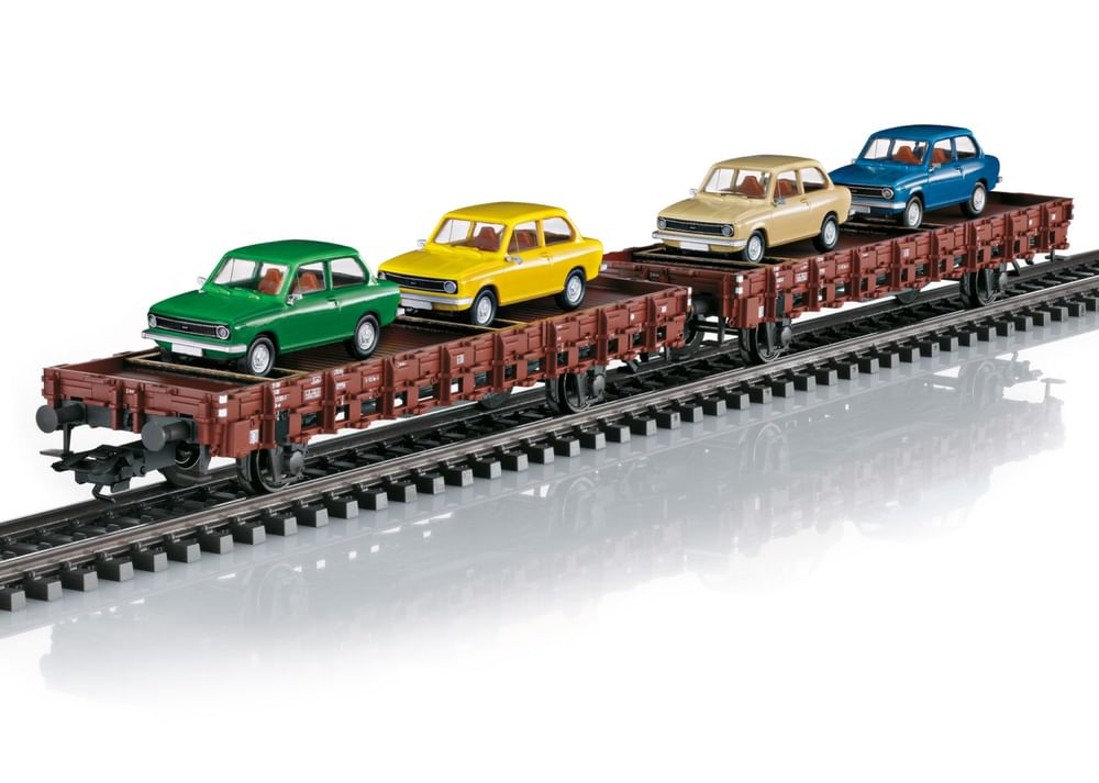 Modell: Wagen mit Sprengwerk. Beladen mit je zwei DAF 66 in unterschiedlichen Farben. Einsteckbare Rungen liegen bei. Länge über Puffer je Wagen 13,9 cm. Gleichstromradsatz E700580.
