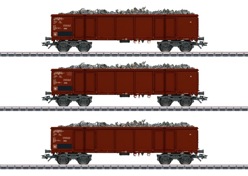 • Model: The cars have type Y25 welded trucks. The freight inserts represent scrap steel. The cars have rectangular buffers. The former DB logo can be recognized prototypically on one car. All of the cars are individually packaged in an additional master package. Length over the buffers per car approximately 16.1 cm / 6-3/8". DC wheelset E700580.