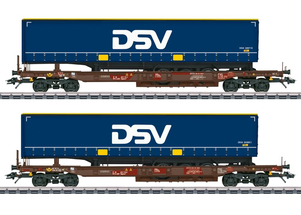 >Prototype: Two type Sdgmns deep well flat cars for AAE Cargo, Inc. Flat cars for transporting containers, truck interchangeable load units, or semi-rig trailers. Each car loaded with a curtain tarp semi-rig trailer for the freight forwarder DSV.