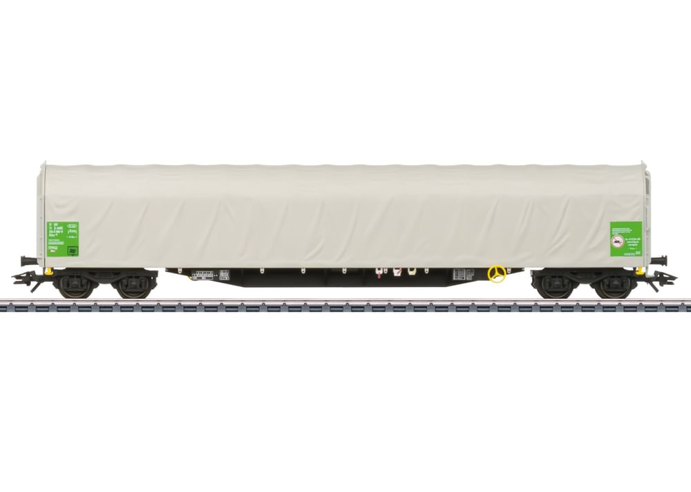 Spezifische Ausführung des Unterbodens. Viele angesetzte Details. Mit rechteckigen Puffern und Handrad für Feststellbremse. Drehgestelle Typ Y25. Metalleinlage für gute Laufeigenschaften. Darstellung mit geschlossener Plane. Länge über Puffer 22,9 cm.