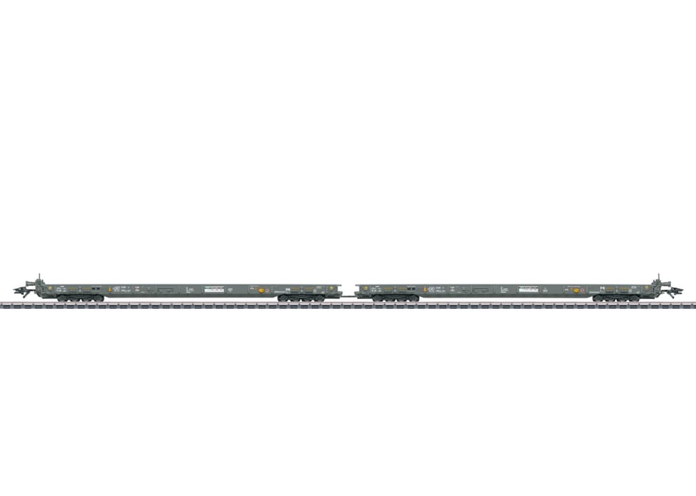 >Prototype: Two type Saadkmms depressed floor flat cars for RAlpin, Inc. AG (Olten, Switzerland), for transit traffic on the "Rollende Landstraße" / "Rolling Road". Quarz gray basic paint scheme. The cars look as they did starting in 2018.