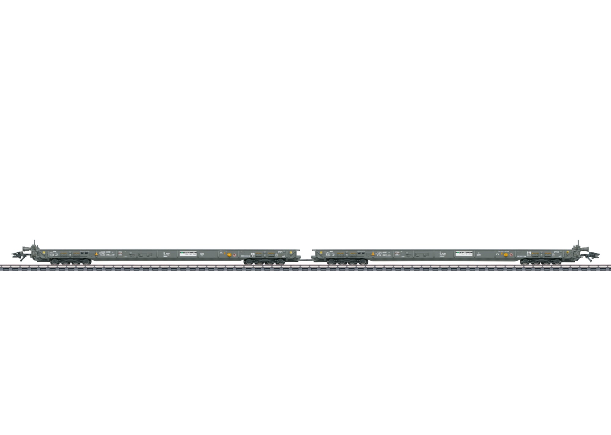 • Model: The cars have bodies constructed of metal. Each car has 2 hinged and removable buffer beams. Chock blocks for truck models and special couplers for depressed floor flat cars are included. Special close couplers for coupling to cars and locomotives with standard couplers are included. Both cars are packaged individually and there is a master package. Total length over the buffers approximately 44.6 cm / 17-9/16".