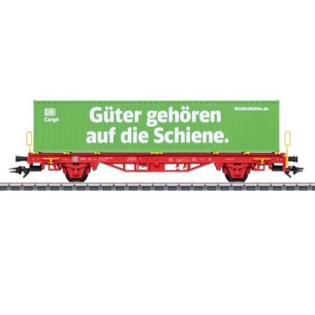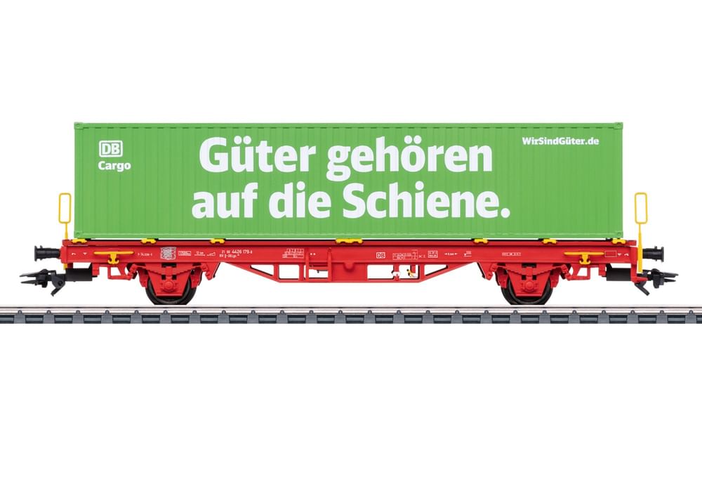 >Vorbild: 2-achsiger Container-Tragwagen Bauart Lgs 580 für den kombinierten Ladungsverkehr. Verkehrsrote Grundfarbgebung. Deutsche Bahn AG (DB AG). Tragwagen beladen mit einem 40-ft. Boxcontainer. Betriebszustand um 2021.