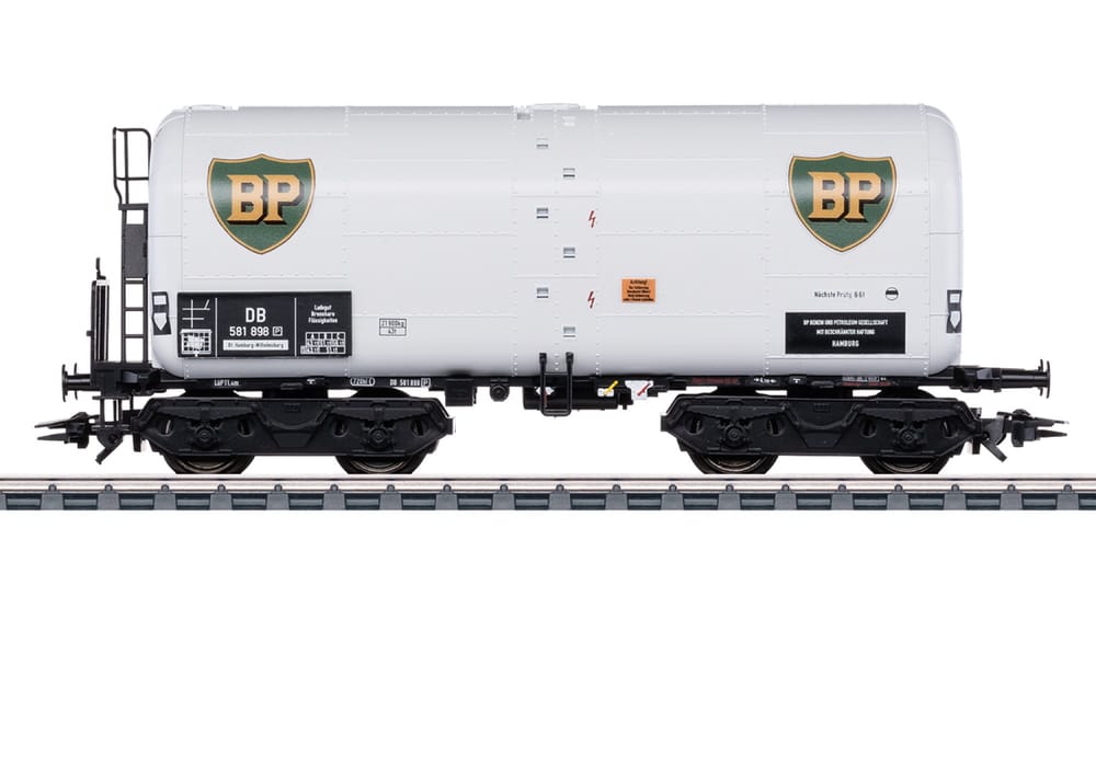 >Vorbild: Vierachsiger Schweröl-Kesselwagen mit Bremserbühne. Privatwagen der BP Benzin- und Petroleum GmbH, Hamburg, eingestellt bei der Deutschen Bundesbahn (DB). Betriebszustand um 1957.